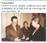 Charles Carson, peintre québécois recevant la médaille d'honneur de la ville lors du vernissage de son exposition.