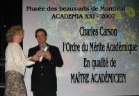 L'Académie International des Beaux-Arts du Québec - décerne à - Charles Carson - l'Ordre du Mérite Académique - En qualité de - MAÎTRE ACADÉMICIEN - Cet honneur lui est rendu pour la qualité de son oeuvre tout au long de sa carrière et pour sa démarche artistique remarquable.