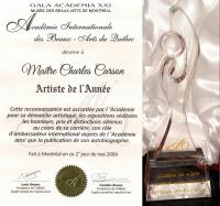 LOUIS BRUENS : Le parcours de l’artiste qui vous est actuellement présenté est tout simplement ahurissant. Que ce soit en Amérique du Nord, en Amérique du Sud ou en Europe, les spécialistes, historiens d’art, experts, analystes et galeristes s’accordent pour le mettre à l’honneur, partout où il passe. Cet artiste s’est distingué à différents titres depuis le dernier Gala. On ne peut résumer ce que vous voyez à l’écran, car, il s’agit du résultat d’une trentaine d’années d’efforts, de présentations et d’expositions. Il y a plus de vingt ans, j’écrivais une analyse exhaustive de son travail pictural, suite à quoi d’autres experts en art, au Canada et à travers le monde, ont emboité le pas. La brillante analyse du «Carsonisme» proposée dans le Fine Art magazine, de New York, en février dernier, permet aux collectionneurs de découvrir une facette que seules, les plumes expérimentées et les regards incisifs de Jamie Ellin Forbes & Victor Bennet Forbes pouvaient révéler. Christian SORRIANO Président de DROUOT COTATION à Paris, Éditeur, Expert en Art et en Antiquités, Expert en ventes publiques - Expert et Assesseur à la Commission de Conciliation et d'Expertise Douanière - Expert à l'Union Française et à l'Union Internationale des Experts, disait, en février dernier : «Charles Carson a creusé son sillon vers la postérité artistique, car aujourd'hui, on dit : c'est un Carson, comme on dit c'est un Picasso, un Matisse, un Warhol, un Basquiat et tous les autres artistes immortels.» En 2008, il est médaillé d’or par la ville de Sées, en France, pour son exposition à l’Hôtel de ville. Suite à une autre exposition, au Château Montferrand, cette fois, l’artiste a été couvert d’éloge par la presse française. Charles Carson a aussi présenté deux expositions solos le même jour; une à la galerie Richelieu de Montréal, et une autre au bien connu Bistro à Champlain, à Ste-Marguerite du lac Masson, chez Monsieur Champlain Charest, collectionneur et connaisseur réputé pour sa cave à vin et son flair en art. Sa biographie, écrite par Madame Anne Richer, du Journal La Presse, et annoncée lors du dernier gala, est maintenant publiée. C’est cette carrière, et tous les succès remporté dans le monde depuis le dernier gala, qui font du Maître Charles Carson, l’artiste de l’année - 2009.
