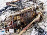 Signe de l'impact négatif des hommes sur la nature. Cette carcasse d'albatros échouée sur l'atoll de Kure au large de la Californie révèle que cet oiseau a avalé des boîtes en plastique qu'il prit pour des poissons... Comme sur nos rivages, en raison du sens des courants océaniques, la mer rejette des centaines de kilos de détritus dans cette région du Pacifique. Document Mindfully