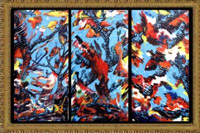 Artiste:Charles Carson Galerie d'art Richelieu,Mtl. Qc. Tél:(514)381-2247 titre : Triptique: Couleurs en éveil Médium : Acrylique sur toile Technique : Carsonisme mouvement Format : 24 x 36 en pouces 61.0 x 91.4 en cm Vendu
