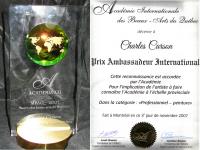 l'Académie Internationale des Beaux-Arts du Québec - décerne à Charles Carson le Prix Ambassadeur International - Cette reconnaissance est accordée par l'Académie - Pour l'implication de l'artiste à faire connaître l'Académie à l'échelle International - Dans la catégorie: «Professionnel - peinture»