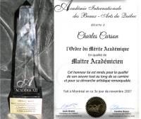 Musée des beaux-arts de Montréal - ACADEMIA XXI - 2007 - L'Académie International des Beaux-Arts du Québec - décerne à - Charles Carson - l'Ordre du Mérite Académique - En qualité de - MAÎTRE ACADÉMICIEN - Cet honneur lui est rendu pour la qualité de son oeuvre tout au long de sa carrière et pour sa démarche artistique remarquable.